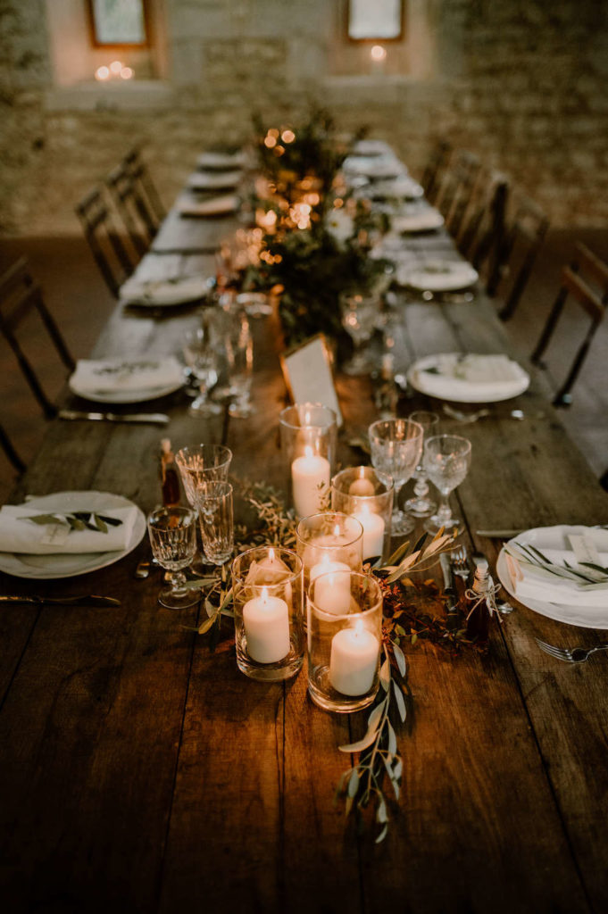 Côté décoration, nous avons choisi des tables et chaises en bois brutes. Des guirlandes ont été suspendues aux poutres pour accentuer le côté chaleureux. Puis nous avons insisté sur le nombre de bougies sur table.