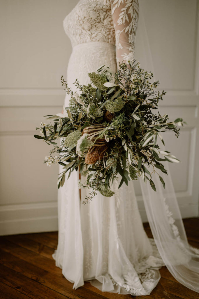 Telle la nature qui reprend ses droits, nous avons pensé les compositions de façon très déstructurées. Le bouquet de mariée était quant à lui 100% végétal pour une parfaite harmonie avec l’esprit champêtre de leur mariage.